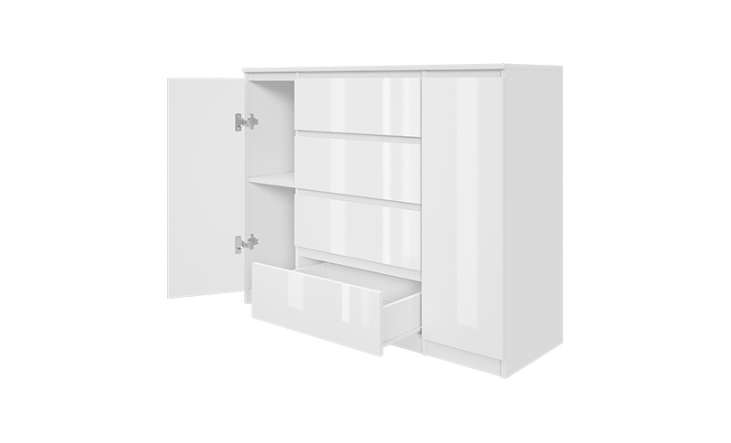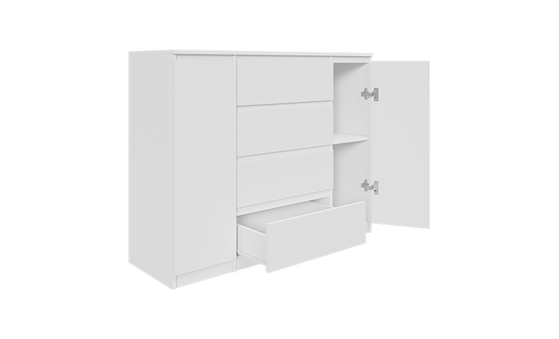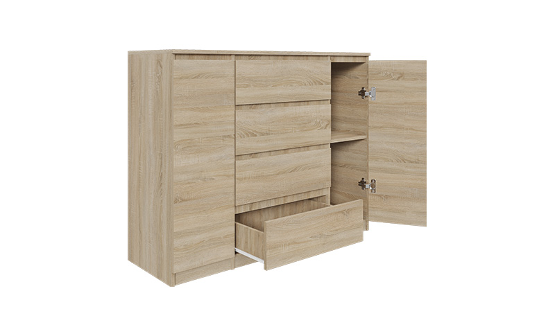 Komoda doskonale wpisuje się w każdą aranżację wnętrza. Jest idealnym dodatkiem zarówno do salonu, jak i sypialni, oferując styl i funkcjonalność. Bez względu na to, czy Twoje wnętrze jest nowoczesne, klasyczne czy industrialne, komoda pokojowa będzie stanowić doskonałe uzupełnienie. Posiada zarówno szafki, w których można ukryć większe przedmioty, jak i szuflady, które są idealne do organizacji drobniejszych rzeczy, takich jak bielizna czy akcesoria.